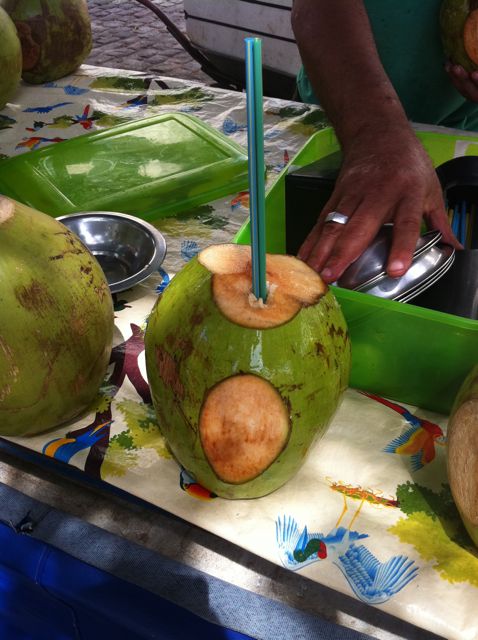 We met with the teacher – Ariella – in the Turismo. And she was my guide for the next three hours. But first, before Luizenete had to go back to work, we had a snack of coconut and coconut milk, freshly cut by the stall holder.  Sweet and delicious and refreshing and not at all like coconut I've had before. It's not easy to work with (See below).  A man comes over and starts quoting philosophical proverbs and shaking our hands.  He is stick thin and really intense.  The gist is that we all make mistakes and we try to swap some proverbs back.  HIs is a sad story according to the stall holder – he was a lecturer once. Then he drank too much and now he is in th Mercado most days.