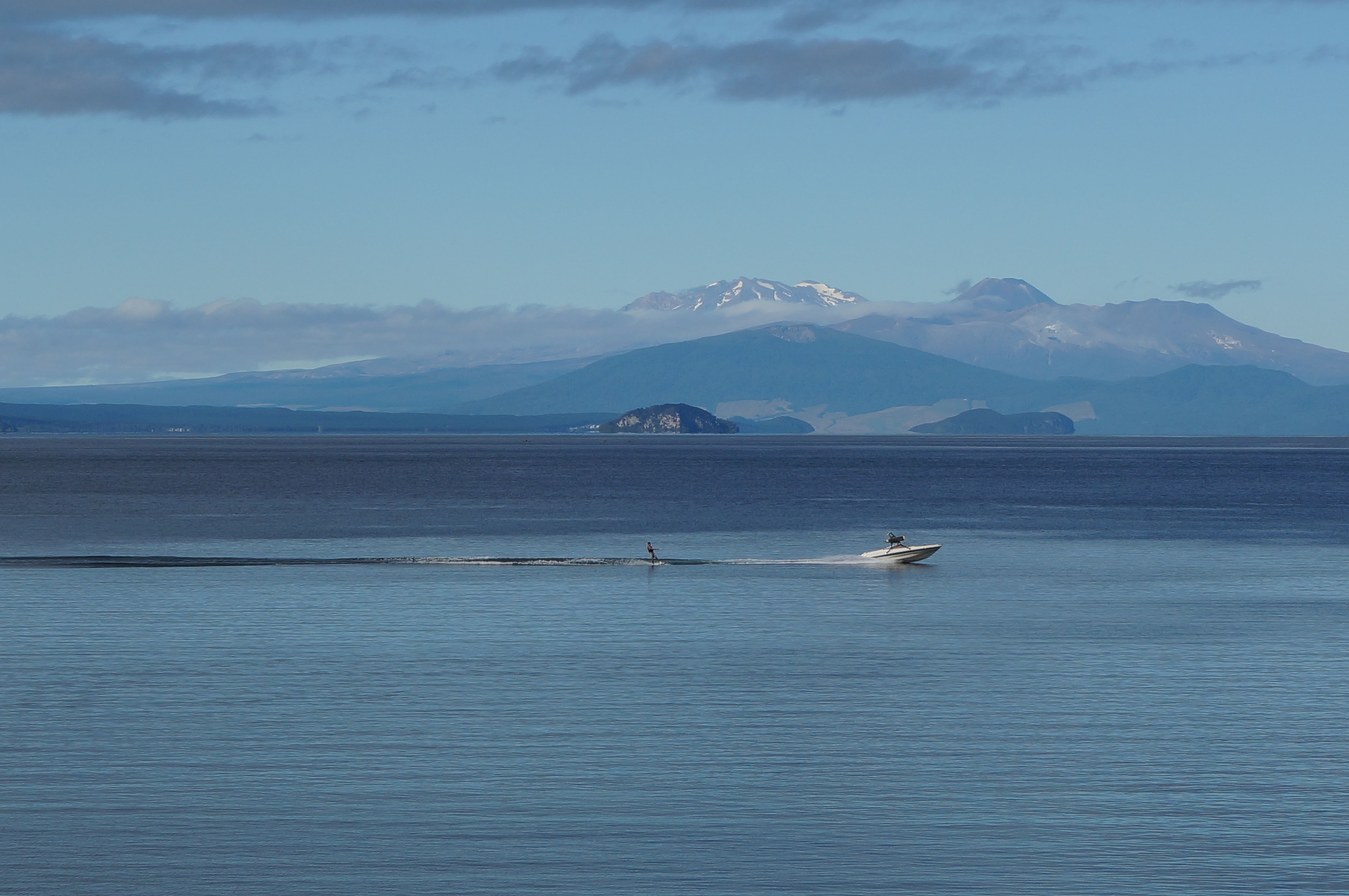 So here I begin summarising – or trying to – the first eventful week in New Zealand.  Here on the shores of Lake Taupo – a weekend retreat with Garry and Helen and Caroline. As I write, the late afternoon sun is lighting up the spray from a water skier out on the deep blue waters of the lake. Waters which reflect the deep blue sky and stretch out to the mountains and volcanoes on the far shore, over which tiny wisps of clouds are settling.  It’s really very nice here. And my first time on the North Island and my first time in a spa hotel in such a place…