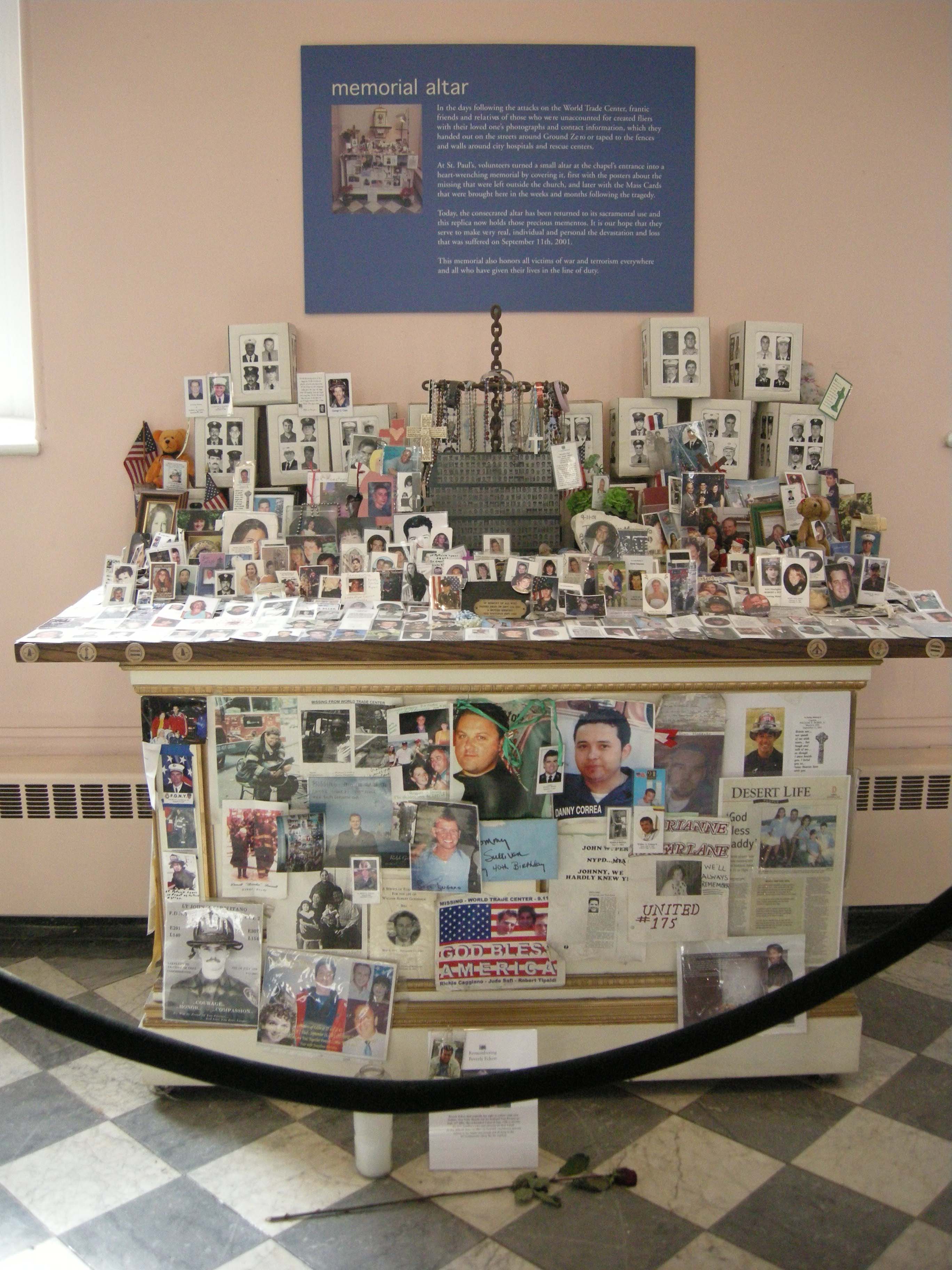 Here was the hub of the clearing up operation afterwards. And a place where people gathered just to get over it. Exhausted and traumatized emergency workers, grieving relatives everyone came here. It’s got lots of displays of memorabilia, very poignant and atmospheric. One of the 9/11 widows started up a self-help group after the attacks and she was one of those killed in the air crash last week in Buffalo. Her picture, and that of her husband who died in the trade center are at the bottom of the memorial altar below. One of many shrines in the chapel.